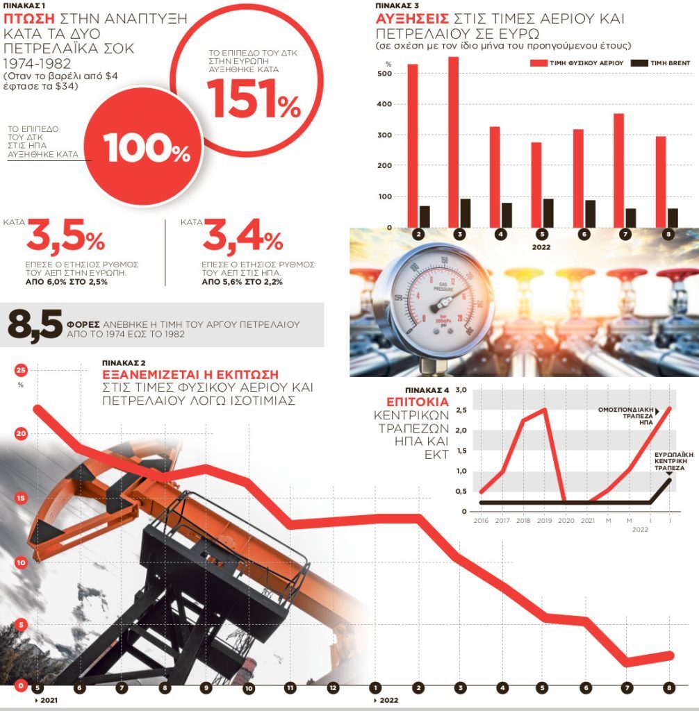 Η αλληλουχία των «εκρήξεων» μεταξύ εκτόξευσης των τιμών ενέργειας, πληθωρισμού, αύξησης επιτοκίων και πτώσης της ανάπτυξης δεν είναι καινούργιο φαινόμενο. Το έχουμε ζήσει εντονότατα την περίοδο 1974-1982 όταν η τιμή του αργού πετρελαίου ανέβηκε κατά 8,5 φορές. Οι ανατιμήσεις σε όλα τα ενεργειακά καύσιμα τότε δημιούργησαν κύμα πληθωρισμού που οδήγησε σε διπλασιασμό του επιπέδου των τιμών καταναλωτή στις ΗΠΑ και σε μία και μισή φορά υψηλότερο επίπεδο τιμών στην Ευρώπη. Και στις δύο περιπτώσεις ο πληθωρισμός από μονοψήφιος έγινε διψήφιος προτού πέσει σε μονοψήφιο από το 1983 και μετά. Επακόλουθο του υψηλού πληθωρισμού ήταν και τότε η άνοδος του κόστους του χρήματος σε όλες τις χρηματικές δραστηριότητες, η οποία οδήγησε σε συρρίκνωση της ανόδου του ΑΕΠ, όπου στην Ευρώπη από 6% έπεσε στο 2,5% και στις ΗΠΑ από 5,6% στο 2,2%. Επομένως η μεν Ευρώπη έχανε κάποιες 3,5 ποσοστιαίες μονάδες ανά έτος μέχρι το 1982 και οι ΗΠΑ περί τις 3,4 ποσοστιαίες μονάδες ΑΕΠ κατά το ίδιο χρονικό διάστημα. Μπορεί να συμβεί κάποια παρόμοια απώλεια ανάπτυξης εφέτος και τα επόμενα χρόνια στην Ευρώπη, γεγονός που θα επηρεάσει άμεσα και εμάς;