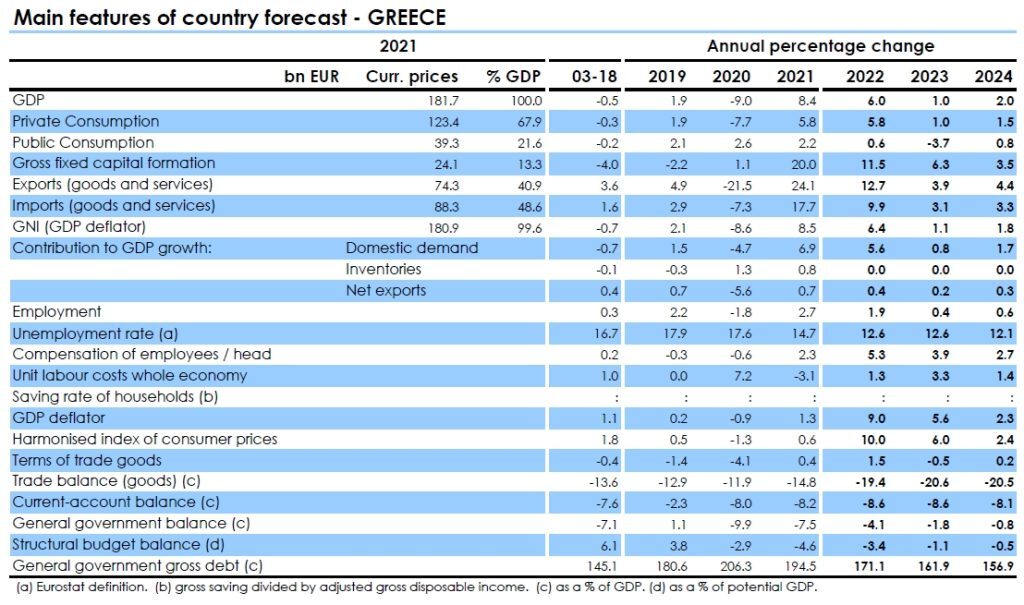 Συγκεκριμένα, η Ευρωπαϊκή Επιτροπή εκτιμά ότι, το 2022, η Ελλάδα θα παρουσιάσει ρυθμό ανάπτυξης σημαντικά υψηλότερο των προηγούμενων εκτιμήσεων και διπλάσιο του ευρωπαϊκού μέσου όρου.