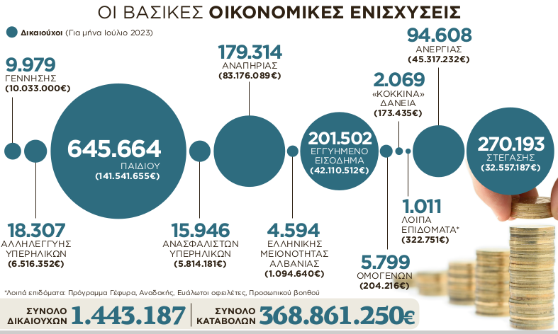 *Το επίδομα παιδιού, που για τα εισοδήματα ως 10.000 ευρώ ξεκινά από 70 ευρώ το μήνα στο ένα παιδί πάει στα 140 ευρώ με δύο, στα 280 ευρώ με τρία παιδιά και στα 420 ευρώ το μήνα με τέσσερα.