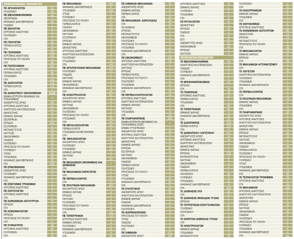 Ειδικότερα, θα καλυφθούν 3.502 θέσεις Πανεπιστημιακής Εκπαίδευσης, 1.565 κατηγορίας Τεχνολογικής Εκπαίδευσης και 57 Ειδικού Επιστημονικού Προσωπικού, για τις οποίες το ΑΣΕΠ θα εκδώσει προκηρύξεις μετά την ανακοίνωση των αποτελεσμάτων του διαγωνισμού. Επισημαίνεται ότι στις θέσεις ανά υπουργείο περιλαμβάνονται συγκεντρωτικά όλες οι θέσεις στην Κεντρική Υπηρεσία, στις Γενικές και Ειδικές Γραμματείες, στις αποκεντρωμένες – περιφερειακές υπηρεσίες, καθώς και τα ΝΠΔΔ και ΝΠΙΔ που είναι υπό την εποπτεία του κάθε υπουργείου.