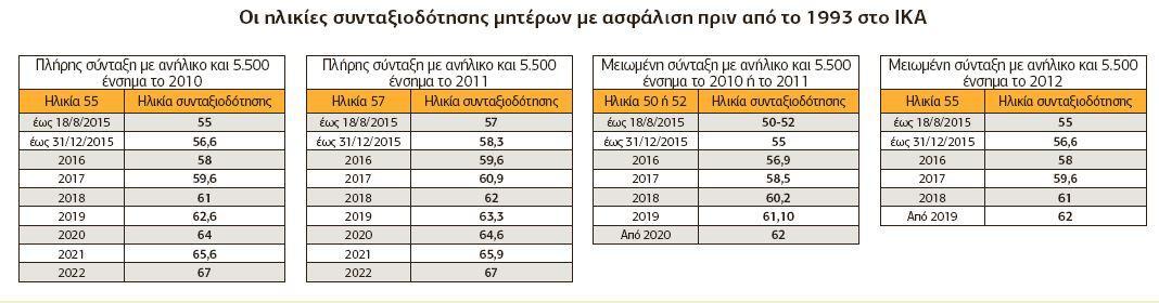 1. Μητέρες με ασφάλιση πριν από το 1993 στο ΙΚΑ που είχαν ή συμπληρώνουν με πλασματικούς χρόνους ανεργίας και ασθένειας τις 5.500 ημέρες με ανήλικο παιδί έως το 2010, κατοχυρώνουν το 55ο έτος. Το νέο όριο για πλήρη σύνταξη είναι 56,5 ετών, εφόσον έκλεισαν το 55ο έτος έως το τέλος του 2015. Αν έκλεισαν τα 55 το 2016 βγαίνουν στα 58, αν τα κλείσουν το 2017, βγαίνουν στα 59,5, αν κλείσουν τα 55 το 2018, βγαίνουν στα 61, ενώ αν το 55ο έτος συμπληρώνεται το 2020 θα συνταξιοδοτηθούν στα 64. Αν όμως τα 55 τα κλείσουν το 2022, βγαίνουν στα 67. Με τα ίδια ένσημα του 2010 κατοχυρώνουν το 50ό έτος για μειωμένη. Ασφαλισμένη που θα έχει όμως τα 50 από 19/8/2015 και μετά, θα πάρει μειωμένη στα 55, ενώ αν το 50ό έτος το συμπληρώσει το 2018, θα πάρει μειωμένη στα 60,2.