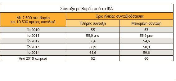 Για όσους συνταξιοδοτούνται με 7.500 ημέρες στα Βαρέα (και συνολικά 10.500 ημέρες ασφάλισης) στο ΙΚΑ, τα όρια ηλικίας δεν αλλάζουν. Οι ασφαλισμένοι κατοχυρώνουν την ηλικία συνταξιοδότησης που ισχύει κατά το έτος που συμπληρώνουν 10.500 ένσημα, εκ των οποίων 7.500 στα Βαρέα.