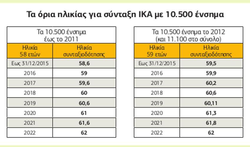 Οσοι έχουν 10.500 ένσημα έως το 2011 κατοχυρώνουν το 58ο έτος, ενώ με 10.500 ένσημα το 2012 κατοχυρώνουν το 59ο έτος.