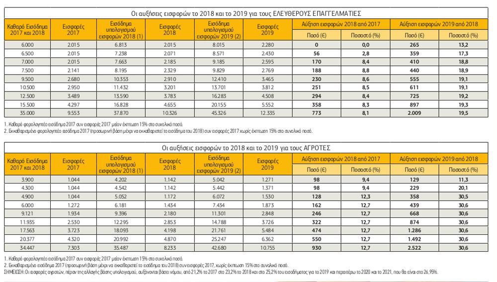 Αυξήσεις εισφορών από 13% ως 30,6% έρχονται από το 2019 για 1,4 εκατ. ασφαλισµένους του ΕΦΚΑ, που προέρχονται από τον ΟΑΕΕ, τον ΟΓΑ και το ΕΤΑΑ. Για τους ελεύθερους επαγγελµατίες, τους αγρότες, τους γιατρούς, τους φαρµακοποιούς, τους µηχανικούς, τους δικηγόρους, τους συµβολαιογράφους, τους δικαστικούς κλητήρες από τη νέα χρονιά οι εισφορές θα θεωρούνται µέρος του εισοδήµατος και δεν θα εκπίπτουν από τις δαπάνες, βάσει του ν. 4472/2017.