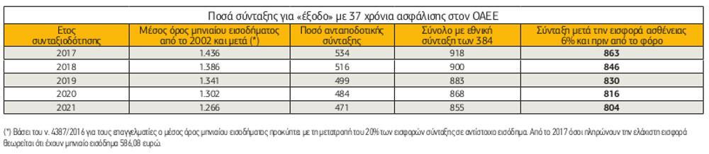Στο παράδειγµα και στο σχετικό πίνακα ο µέσος όρος αποδοχών µε έξοδο το 2017 υποχωρεί στα 1.386 ευρώ. Εποµένως, µε έξοδο το 2018, τα 37 έτη ασφάλισης βγάζουν συνολική σύνταξη (ανταποδοτική και εθνική) στα 846 ευρώ προ φόρου.