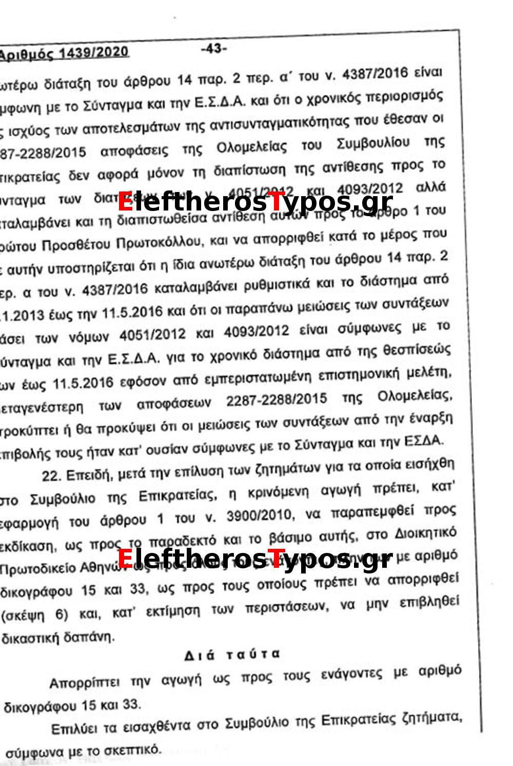 Το Δικαστήριο απέρριψε κατά πλειοψηφία, όπως αναφέρεται στην απόφαση 1439, τους ισχυρισμούς του ΕΦΚΑ, ΕΤΕΑΕΠ και υπουργείου Εργασίας που ζητούσαν στον επανυπολογισμό να ληφθούν υπόψη οι συντάξεις όπως είχαν διαμορφωθεί στις 31/12/2014, δηλαδή να νομιμοποιηθούν οι περικοπές και πριν από το 2016. Ο ισχυρισμός του Δημοσίου απορρίφθηκε διότι το ύψος των συντάξεων μετά τον επανυπολογισμό ήταν διαφορετικό από αυτό του 2014, καθώς ένα μέρος της σύνταξης αντικαταστάθηκε με την προσωπική διαφορά.