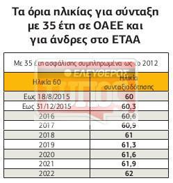 Αν έχουν τα 35 χρόνια ως το 2012 και το 60ό έτος συμπληρώνεται από 19/8/2015 και μετά, τότε αλλάζει και η ηλικία συνταξιοδότησης και αυξάνεται κατά 3 μήνες κάθε έτος. Ασφαλισμένος 60 ετών το 2017 θα συνταξιοδοτηθεί στα 60,9 μήνες.