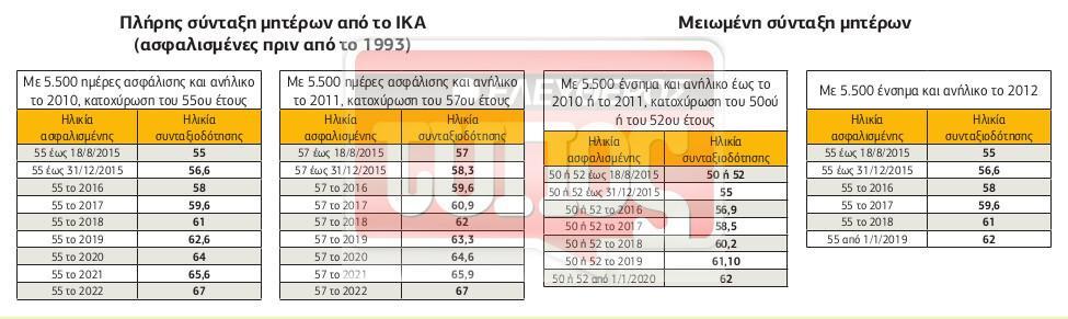 Αν οι 5.500 ημέρες και το ανήλικο υπάρχουν το 2010, κατοχυρώνουν πλήρη σύνταξη στα 55 και μειωμένη στα 50, εφόσον η κατά περίπτωση ηλικία συμπληρώθηκε έως τις 18/8/2015. Αν η ηλικία των 50 για μειωμένη συμπληρωθεί από 19/8/2015 και μετά, τότε το όριο ανεβαίνει στα 55 για το 2015, στα 56,9 για το 2016, στα 58,5 για το 2018 και στα 62 από το 2019 και μετά. Αντίστοιχα, αν τα 55 συμπληρώνονται έως 31/12/2015, το όριο για πλήρη σύνταξη πάει στα 56,6, αν τα 55 συμπληρώνονται το 2016, το όριο ανεβαίνει στα 58 κ.ο.κ. (βλ. σχετικό πίνακα).