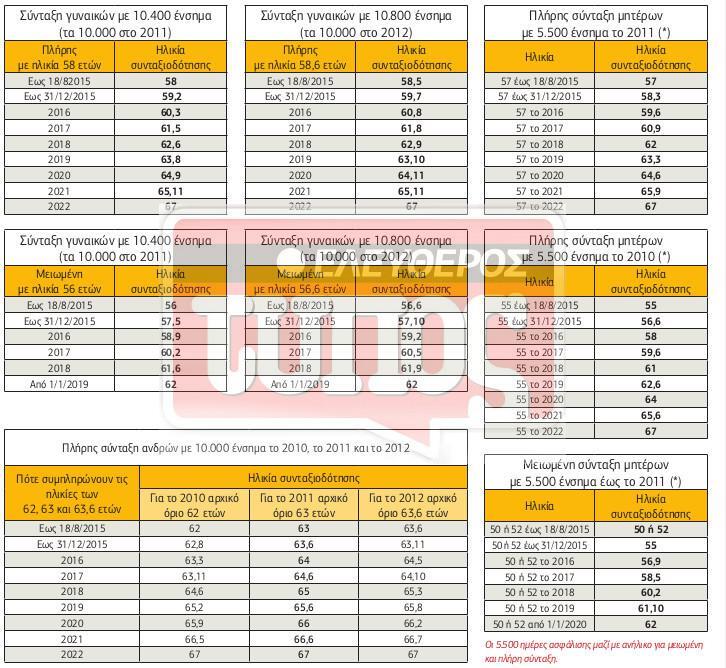 3. Mητέρες με ανήλικο και 5.500 ημέρες ως το 2010 έχουν όριο 55 ετών για πλήρη σύνταξη και όσες το συμπληρώνουν από τις 19/8/2015 ως το 2019 αποχωρούν με τα νέα όρια ηλικίας, που είναι από 56,6 ετών ως 62,6 ετών. Για τη μειωμένη σύνταξη θα πρέπει να έχουν κλείσει το 50ό έτος μέχρι 18/8/2015. Αν κλείνουν τα 50 από 19/8/2015 και μετά, τότε το όριο ανεβαίνει στα 55 για το 2015, στα 56,9 για το 2016, στα 58,5 για το 2017, στα 60,2 για το 2018, στα 61,10 για το 2019 και στα 62 εφόσον κλείνουν το 50ό έτος από το 2020 και μετά.