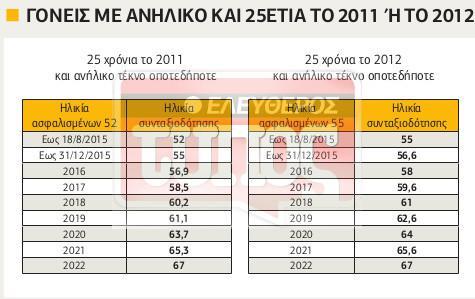 8. Γονείς με ανήλικο τέκνο και με 25ετία τα έτη 2011 και 2012. Είχαν όριο ηλικίας για σύνταξη τα 52 και τα 55. Αν πιάνουν τις ηλικίες αυτές από 19/8/2015 μέχρι το 2017, αποχωρούν σε ηλικίες από 55 έως 59,5 ετών. Ενώ όσοι κλείσουν τα 52 ή τα 55 από το 2018 έως το 2022 βγαίνουν στη σύνταξη από 60,2 έως 67 ετών.