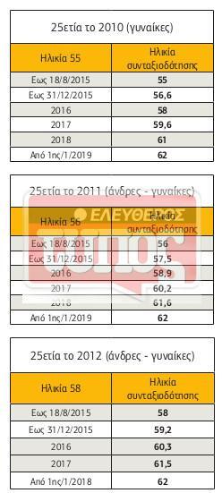 1. Με 25ετία το 2011 μειωμένη σύνταξη, από τα 56 για άνδρες και γυναίκες που έχουν την ηλικία έως 18/8/2015. Αν έκλεισαν τα 56 από 19/8 έως 31/12/2015 θα πάρουν μειωμένη στα 57,5 ή στα 58,9 αν είναι 56 το 2016 ή στα 60,2 αν κλείνουν τα 56 το 2017 ή στα 61,6 αν κλείνουν τα 56 το 2018 και στα 62 από το 2019 και μετά.
