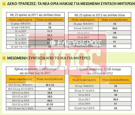 Μητέρες ασφαλισμένες σε Ταμεία ΔΕΚΟ-τραπεζών με ανήλικο τέκνο το 2011 ή το 2012 και ηλικία 50 ή 53 μέχρι 18/8/2015 έχουν θεμελιωμένο δικαίωμα για μειωμένη σύνταξη. Οσες έκλεισαν τα 52 από τις 19/8 μέχρι τις 31/12/2015 θα φορτωθούν 5 έτη και θα συνταξιοδοτηθούν στα 55.
