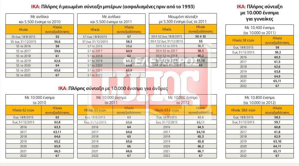 1. Γυναίκες με 10.000 ημέρες ασφάλισης (33,3 έτη) έως το 2010, το 2011 και το 2012 κατοχυρώνουν για τα αντίστοιχα έτη τις ηλικίες των 57, 58 και 58,6 ετών για πλήρη σύνταξη και 55, 56 και 56,6 ετών για μειωμένη. Για παράδειγμα, εργαζόμενη που έχει τις 10.000 ημέρες το 2011 ή έχει 8.800 και εξαγοράζει άλλες 1.200 για να φτάσει στα 10.000 ένσημα το 2011 μπορεί να πάρει πλήρη με το όριο που θα ισχύει όταν κλείσει τα 58. Αν το 58ο έτος το συμπλήρωσε το 2016, θα πάρει σύνταξη στα 60,3 μήνες. Αν συμπληρώνει τα 58 το 2017, θα συνταξιοδοτηθεί με πλήρη στα 61,5 μήνες. Μπορεί όμως να βγει νωρίτερα με μειωμένη, καθώς έχει κατοχυρώσει το όριο των 56 ετών. Αν τα έκλεισε το 2016, παίρνει μειωμένη στα 58,9 μήνες. Αν έκλεισε τα 56 μετά τις 19/8/2015, βγαίνει με μειωμένη στα 57,5.
