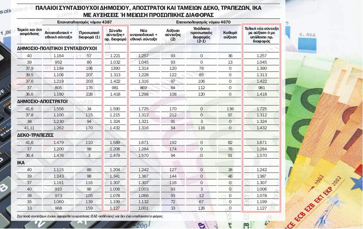Σύμφωνα με τον πίνακα που δημοσιεύει ο «Ε.Τ.» της Κυριακής, οι αυξήσεις που προκύπτουν για τους παλαιούς (πριν από τον Μάιο του 2016) συνταξιούχους μέσα από τον επανυπολογισμό και τον συμψηφισμό των προσωπικών διαφορών έχουν ως εξής: