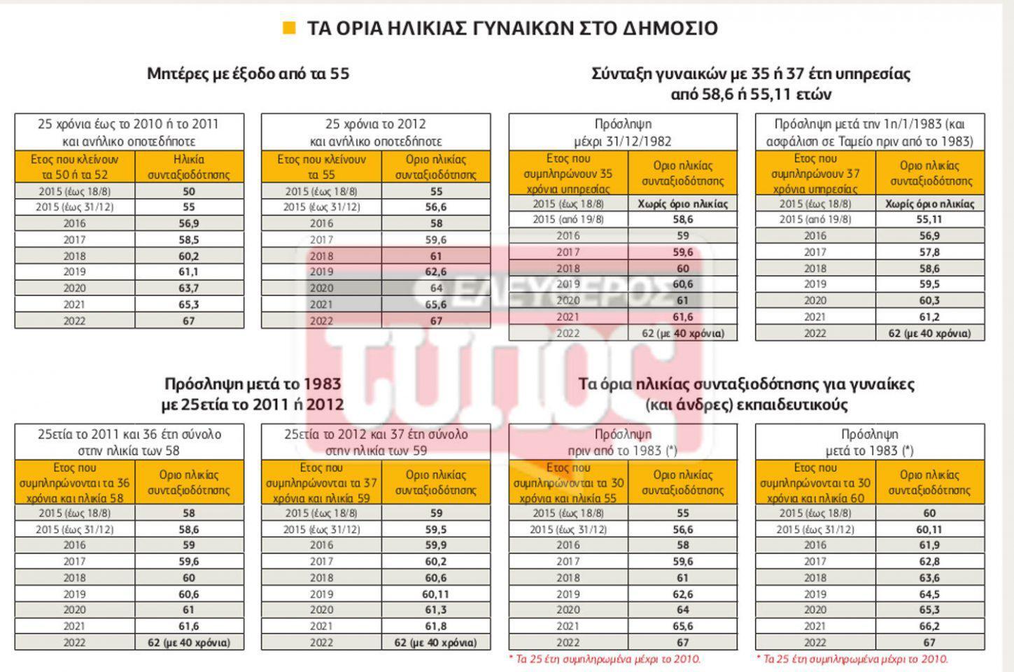 9. Γυναίκες εκπαιδευτικοί με πρόσληψη πριν από το 1983 που έχουν 25ετία έως το 2010 αποχωρούν με συνολικό χρόνο 30 ετών υπηρεσίας και όριο ηλικίας που καθορίζεται από το πότε θα κλείσουν τα 55. Αν η ηλικία των 55 ετών ή τα 30 έτη συμπληρωθούν από 19/8 μέχρι 31/12/2015, βγαίνουν στα 56,6. Αν έχουν τα 30 έτη το 2017 αλλά κλείνουν τα 55 το 2018, βγαίνουν στα 61. κ.ο.κ. (σύμφωνα με το σχετικό πίνακα).