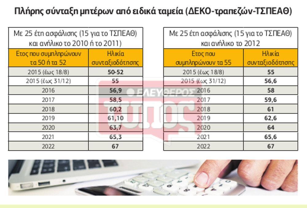 3. Μητέρες ασφαλισμένες μέχρι το 1992 στα Ταμεία Τύπου (ΤΣΠΕΑΘ, ΤΑΤΤΑ, ΤΑΙΣΥΤ) με ανήλικο τέκνο και 15 έως 20 έτη έως το 2012 συνταξιοδοτούνται από τα 55 αν συμπληρώνουν το 50ό, το 52ο ή το 55ο έτος μετά τις 19/8/2015. Ασφαλισμένη στο ΤΣΠΕΑΘ που είχε 15ετία και ανήλικο το 2010 αποφεύγει την αύξηση του ορίου συνταξιοδότησης αν συμπλήρωσε το 50ό έτος πριν από τις 19/8/2015 για πλήρη σύνταξη. Αν το 50ό έτος το συμπληρώνει το 2016 θα αποχωρήσει όταν γίνει 56,9 ετών.