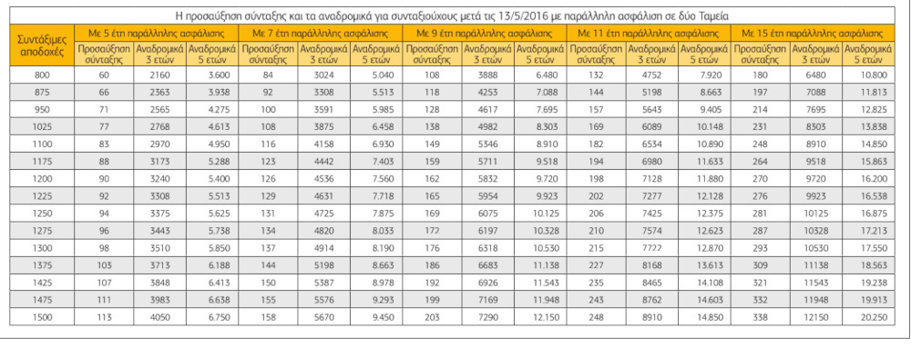 - Συνταξιούχος του 2017 με 5 χρόνια παράλληλης ασφάλισης ως το 2016 και συντάξιμες αποδοχές 800 ευρώ δικαιούται προσαύξηση 60 ευρώ στη σύνταξη με αναδρομικά 5ετίας 3.600 ευρώ.