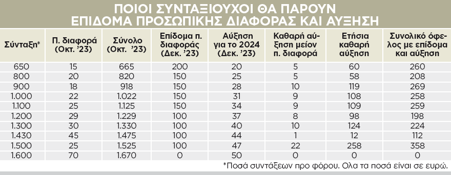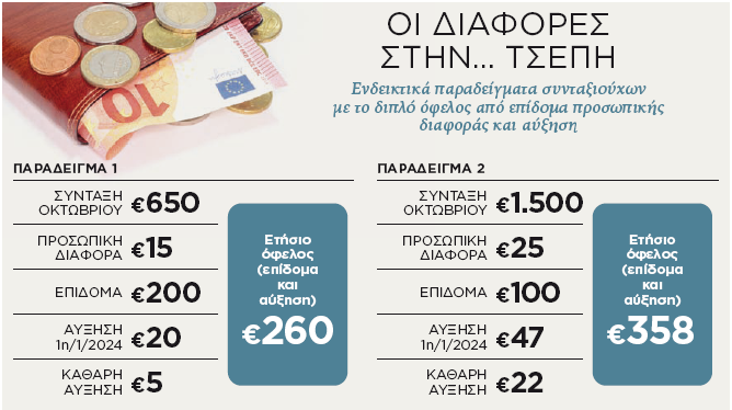 - Συνταξιούχος με κύρια σύνταξη 650 ευρώ και προσωπική διαφορά 15 ευρώ τον Οκτώβριο (σύνολο 665 ευρώ προ φόρου) είναι δικαιούχος επιδόματος 200 ευρώ, που θα το πληρωθεί τον Δεκέμβριο. Η αύξηση 3,1% για το 2024 βγαίνει στα 20 ευρώ, από τα οποία όμως η καθαρή αύξηση μείον την προσωπική διαφορά θα είναι 5 ευρώ (20-15=5). Το διπλό κέρδος που θα έχει σε ετήσια βάση ο συνταξιούχος από το επίδομα και την καθαρή αύξηση είναι 260 ευρώ.