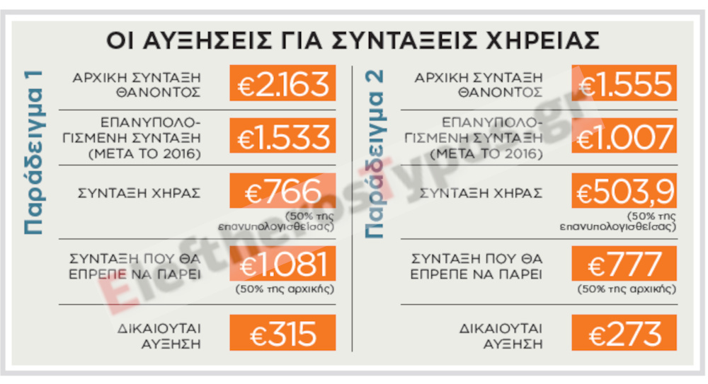 Ιδού μερικές χαρακτηριστικές περιπτώσεις για το πώς οι συντάξεις χηρείας των συζύγων θανόντων αποστράτων, αντί για το 50% της αρχικής σύνταξης, πληρώθηκαν το 30%.