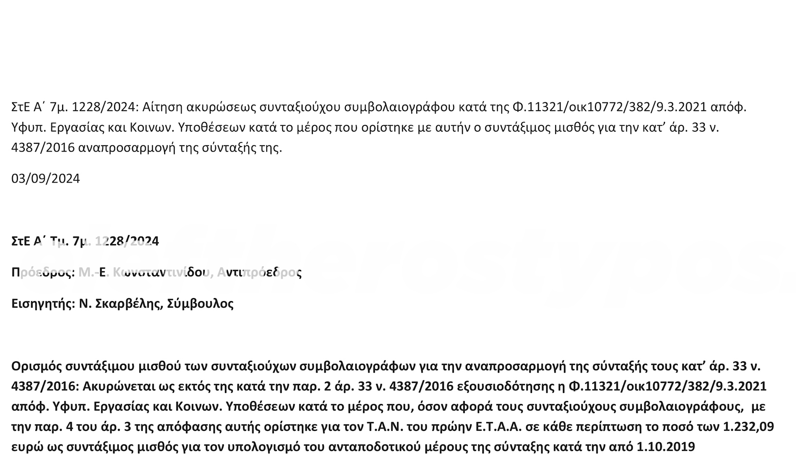 Το ΣτΕ με την 1228/2024 απόφασή του (Α’ τμήμα 7μελές), που δημοσιεύτηκε στις 3 Σεπτεμβρίου 2024, ακυρώνει υπουργική απόφαση του 2021 (την Φ.11321/οικ10772/382/9.3.2021 του υφυπουργού Εργασίας Π. Τσακλόγλου) κατά το μέρος που ορίζει συντάξιμο μισθό για τον επανυπολογισμό των συντάξεων των συμβολαιογράφων το ποσό των 1.232,09 ευρώ.