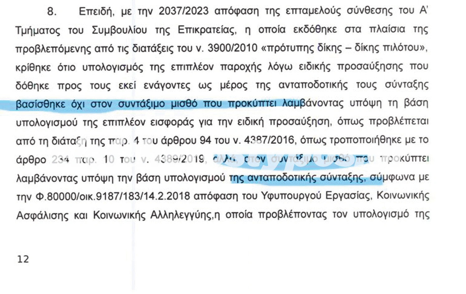 Η απόφαση δικαιώνει συνταξιούχο του ΤΣΜΕΔΕ και ακυρώνει την Φ.80000/οικ.9187/183/2018 απόφαση, καθώς η σύνταξη που πήρε ο εν λόγω συνταξιούχος που αποχώρησε το 2018 υπολογίστηκε ως προς την Ειδική Προσαύξηση με μικρότερες αποδοχές από αυτές που αναλογούσαν στις εισφορές που είχε καταβάλει στον κλάδο της Ειδικής Προσαύξησης. Ο συνταξιούχος είχε καταβάλει 36 έτη και 11 μήνες εισφορές στον κλάδο κύριας σύνταξης και 33 έτη και 11 μήνες (παράλληλα) στον κλάδο Ειδικής Προσαύξησης. Η σύνταξη που πήρε βγήκε στα 1.241 ευρώ (εθνική 384 ευρώ, ανταποδοτική 698,89 ευρώ και 158 ήταν προσωπική διαφορά), ενώ αν η Ειδική Προσαύξηση υπολογιζόταν με τις εισφορές που είχε καταβάλει για τα 33 έτη και 11 μήνες στον κλάδο, η σύνταξη θα ήταν περίπου κατά 500 ευρώ υψηλότερη.