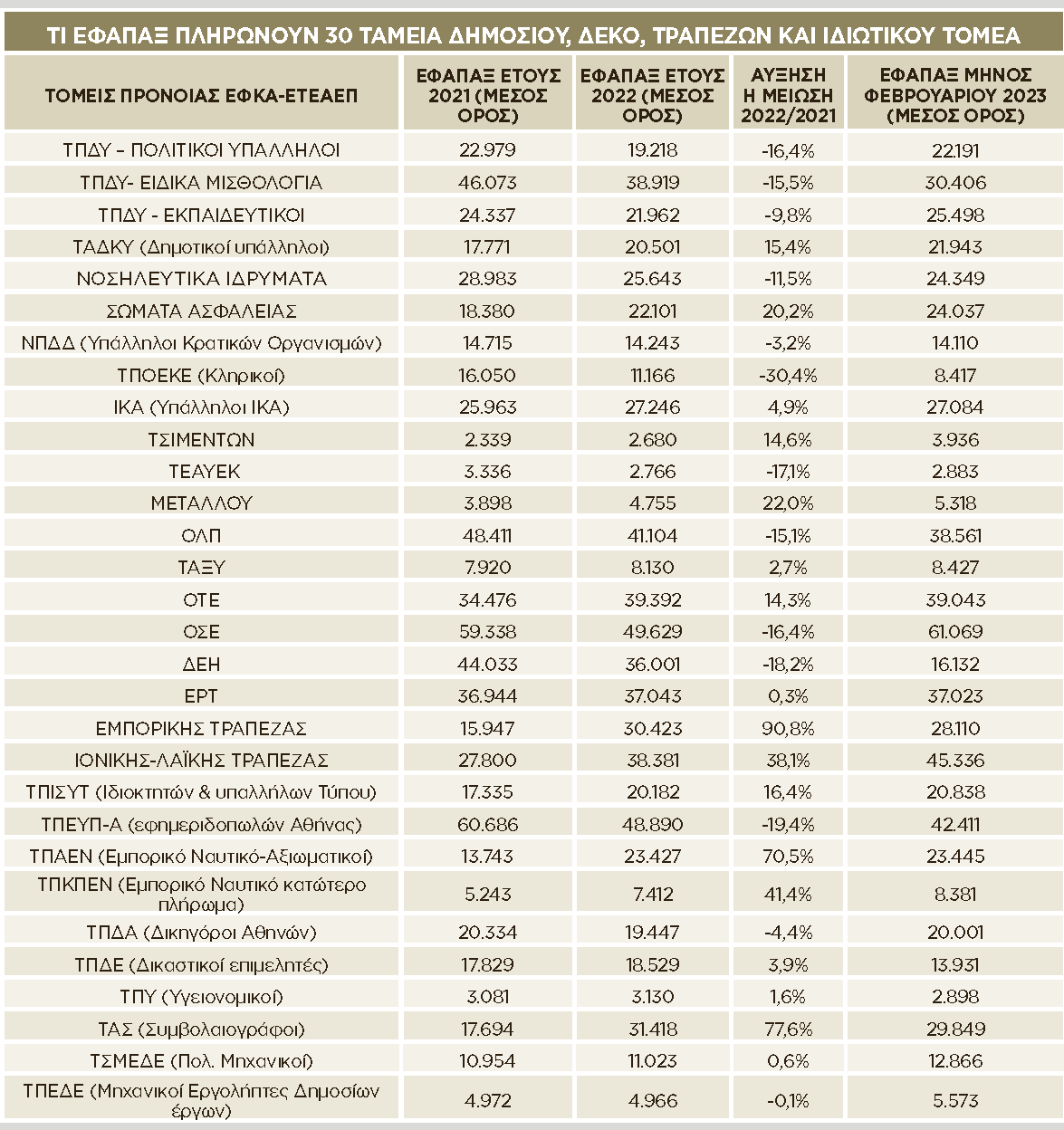 Σύμφωνα με τον πίνακα από στοιχεία του ΕΦΚΑ που δημοσιεύει ο «Ε.Τ.» το εφάπαξ για το 2022 μειώθηκε σε 12 ταμεία, αυξήθηκε σε 17 και σε 1 έμεινε αμετάβλητο.