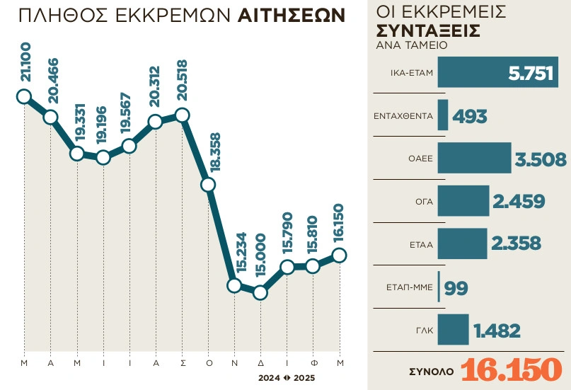 Την ίδια στιγμή σύμφωνα με τα τελευταία στοιχεία της έκθεσης ΑΤΛΑΣ, τον Μάρτιο βρίσκονταν σε λίστα αναμονής 16.150 εκκρεμείς συντάξεις. Ο αριθμός αυτό, αν και οριακά αυξημένος σε σχέση με τις εκκρεμείς αιτήσεις του Φεβρουαρίου (15.810) και του Ιανουαρίου (15.790), είναι αισθητά μειωμένος σε σχέση με τον Μάρτιο του 2024, που ήταν σε λίστα αναμονής 21.100 κύριες συντάξεις. Η μείωση των εκκρεμοτήτων είναι εντυπωσιακή, αν οι 16.150 εκκρεμείς συντάξεις του Μαρτίου του 2025, συγκριθούν με τον Μάρτιο του 2020, όπου η λίστα απαριθμούσε 137.334 εκκρεμείς συντάξεις!