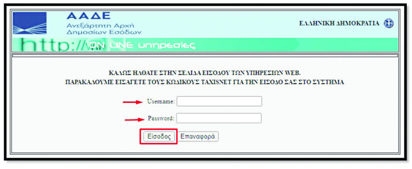 1 Ο αιτών συμπληρώνει τους προσωπικούς του κωδικούς Taxisnet για να γίνει η πιστοποίηση, καταχωρίζει τον ΑΜΚΑ του και επιλέγει «Είσοδος».