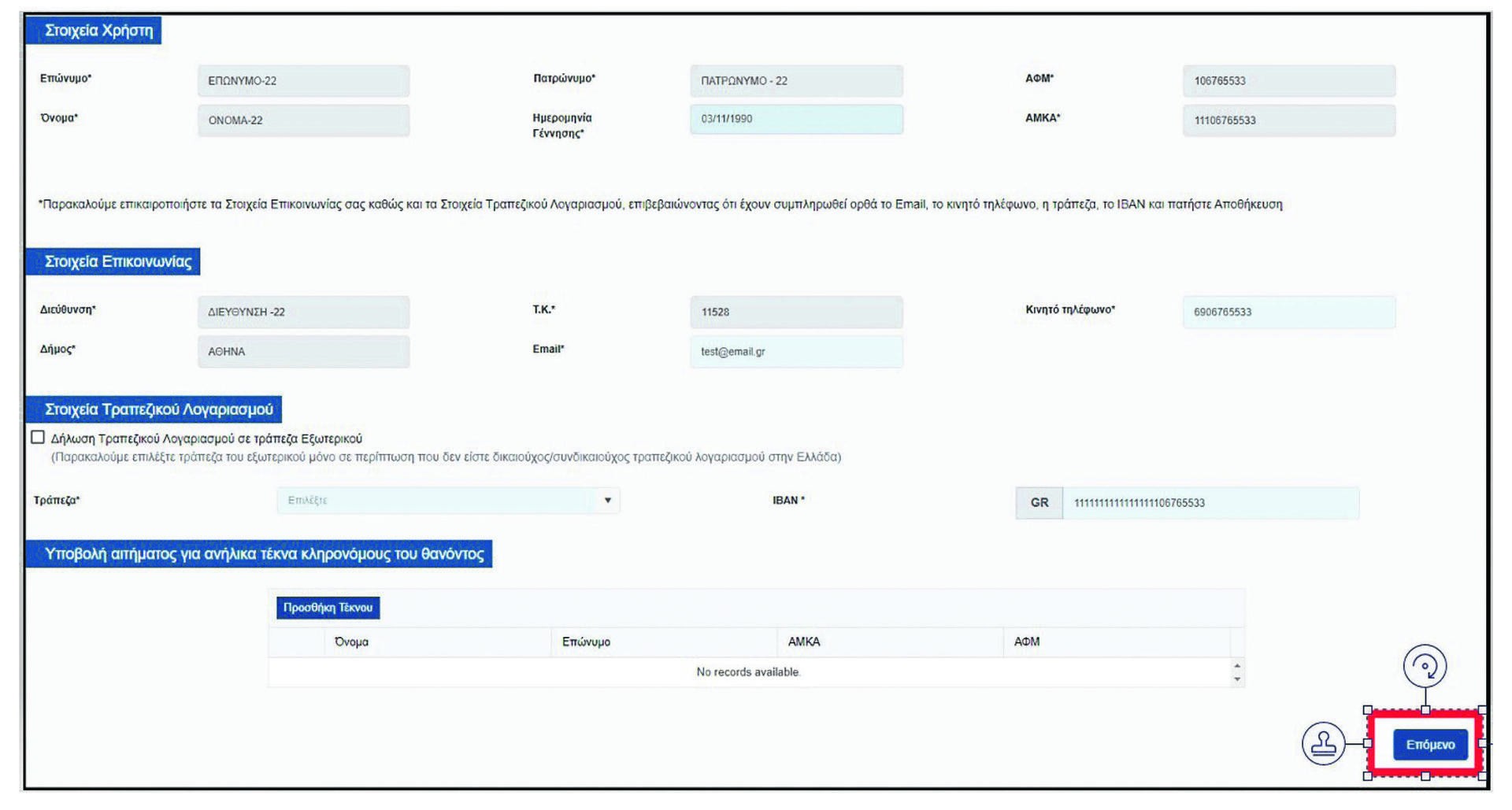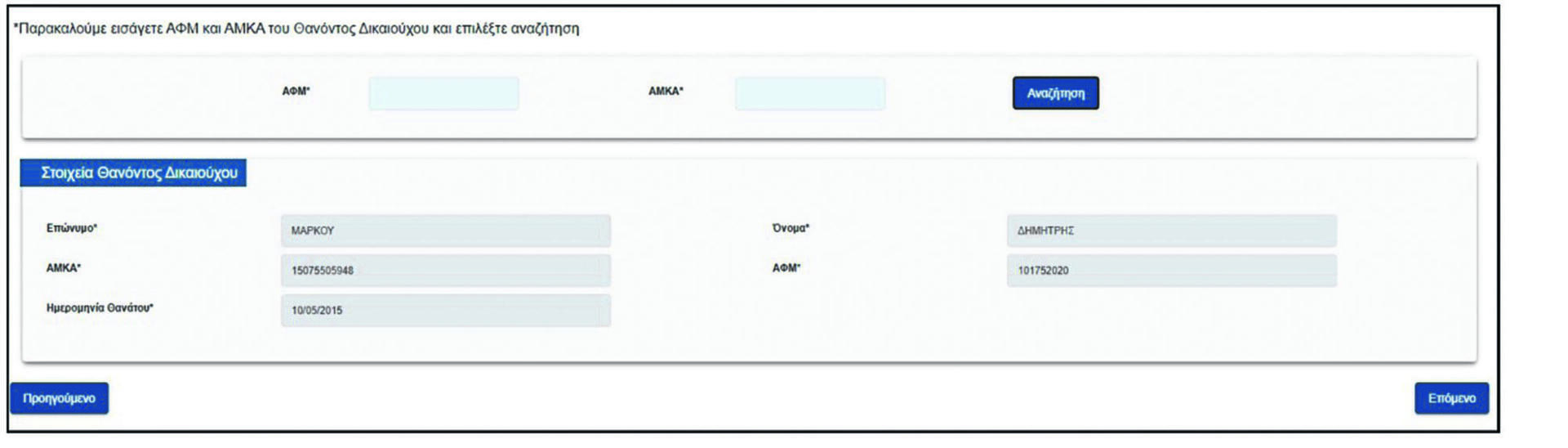 5 Στη συνέχεια, συμπληρώνει τον ΑΜΚΑ και τον ΑΦΜ του θανόντος, οι οποίοι ελέγχονται από το σύστημα. Αν υπάρχουν καταχωρισμένα, τότε προχωράει στο επόμενο βήμα, διαφορετικά η ολοκλήρωση της αίτησης δεν μπορεί να συνεχιστεί μέχρι να πιστοποιηθούν τα στοιχεία θανόντος.