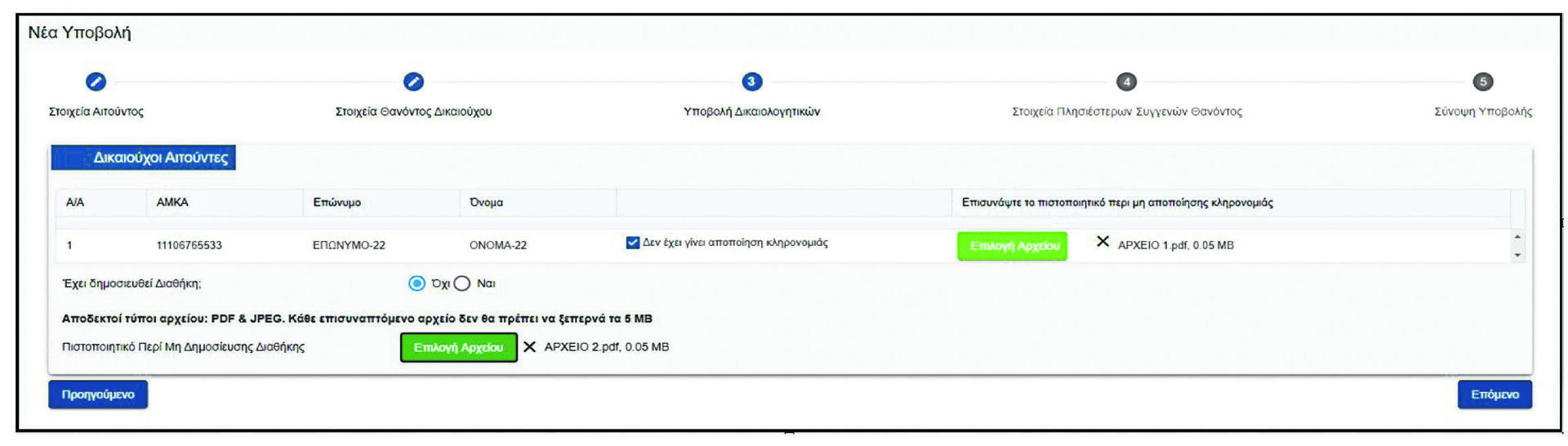 6 Αφού πιστοποιηθούν ο ΑΜΚΑ και ο ΑΦΜ του θανόντος, o αιτών καλείται να επισυνάψει το «Πιστοποιητικό περί μη αποποίησης κληρονομιάς». Αν υπάρχει αποποίηση της κληρονομιάς, δεν συνεχίζει η διαδικασία της αίτησης.