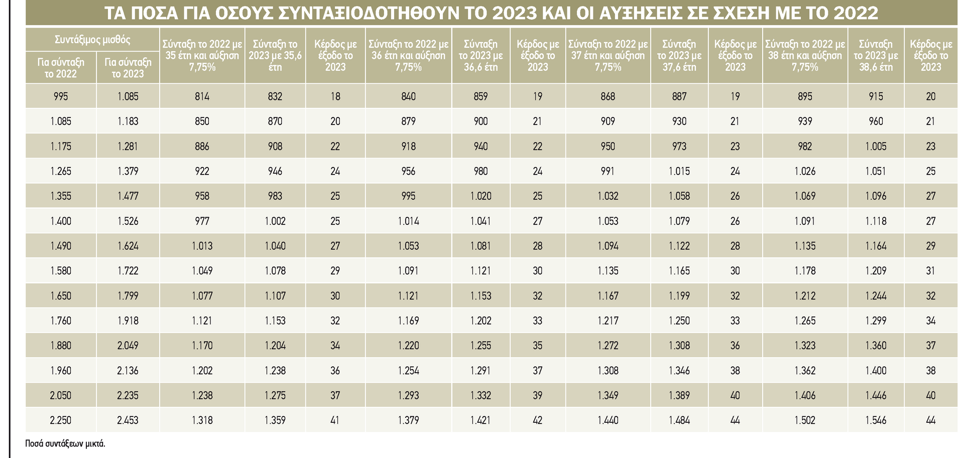 Το αναλυτικό παράδειγμα που δημοσιεύει το ένθετο «Ασφάλιση και Συντάξεις» είναι αποκαλυπτικό, καθώς δείχνει ότι ακόμη και με τα ίδια έτη και τον ίδιο συντάξιμο μισθό ένας ασφαλισμένος που θα βγει το 2023 θα πάρει μεγαλύτερη σύνταξη κατά 8,5% σε σχέση με αυτή που θα είχε αν έβγαινε το 2022.