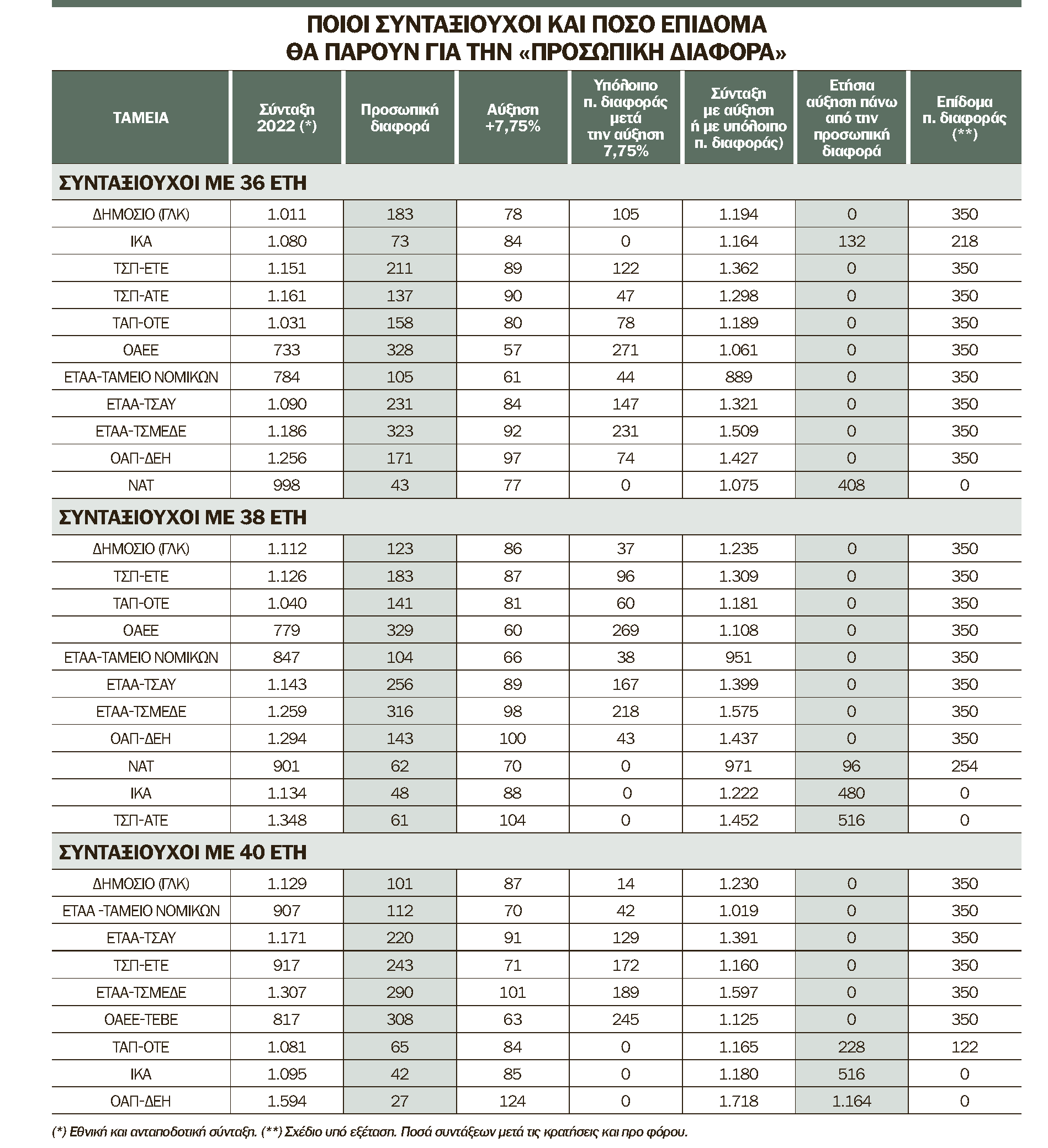 1 Συνταξιούχοι του ΙΚΑ με 36 έτη έχουν μέση εθνική και ανταποδοτική σύνταξη 1.080 ευρώ με προσωπική διαφορά 73 ευρώ. Με την αύξηση 7,75% μηδενίζουν την προσωπική διαφορά και το καθαρό κέρδος σε ετήσια βάση είναι 132 ευρώ. Με τα εξεταζόμενα σενάρια μπορεί να πάρουν επίδομα που θα είναι 218 ευρώ, ώστε μαζί με την αύξηση να συμπληρώσουν 350 ευρώ.