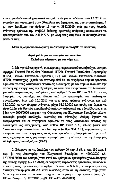 * Ο τέταρτος ενάγων εδικαιούτο να λάβει εθνική και ανταποδοτική σύνταξη 2.900,96 ευρώ μηνιαίως (4.834,93 ευρώ Χ 60% = 2.900,96 ευρώ). με αναδρομικά 8.455,80 ευρώ από 18.2.2020 έως 31.12.2020.