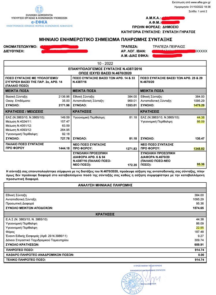 *Συνταξιούχος που λαμβάνει 1.100 ευρώ εθνική και ανταποδοτική σύνταξη και άλλα 300 ευρώ ως προσωπική διαφορά (σύνολο 1.400 ευρώ), έχει την κράτηση 6% για ασθένεια στα 1.100 ευρώ και πληρώνει 66 ευρώ υπέρ ΕΟΠΥΥ. Η προσωπική διαφορά δεν έχει καμία κράτηση, και το ποσό της σύνταξης προ φόρου είναι 1.034 ευρώ εθνική + ανταποδοτική σύνταξη και 300 ευρώ προσωπική διαφορά (σύνολο 1.334 ευρώ). Η κράτηση 1,5% υπέρ ΤΑΠΑΣΑ που ακολουθεί θα έπρεπε να επιβάλλεται στα 1.034 ευρώ (εθνική και ανταποδοτική μετά το 6% του ΕΟΠΥΥ), και κανονικά θα έπρεπε να είναι 15,5 ευρώ. Αυτό που γίνεται όμως είναι ότι το 1,5% χρεώνεται στην αρχική σύνταξη των 1.100 ευρώ μαζί με την προσωπική διαφορά των 300 ευρώ, δηλαδή η κράτηση επιβάλλεται στα 1.400 ευρώ και ο συνταξιούχος πληρώνει 21 ευρώ, αντί 15,5 ευρώ. Τα 4,5 ευρώ τον μήνα θα πρέπει να του επιστραφούν αναδρομικά από το 2019, με ένα ποσό της τάξης των 216 ευρώ.