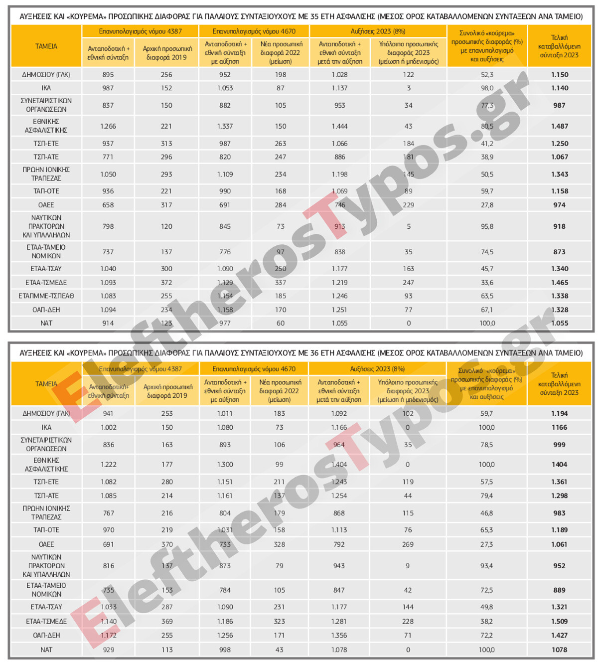 Στους πίνακες των συντάξεων και των προσωπικών διαφορών των παλαιών συνταξιούχων με 35 ως 40 έτη ασφάλισης που αποκαλύπτει το ένθετό μας φαίνεται ότι πολλοί συνταξιούχοι, μετά την αύξηση που πήραν στον επανυπολογισμό σύνταξης με το νόμο 4670 (νόμος Βρούτση), θα καταφέρουν να μηδενίσουν την προσωπική διαφορά με την αύξηση του 2023.