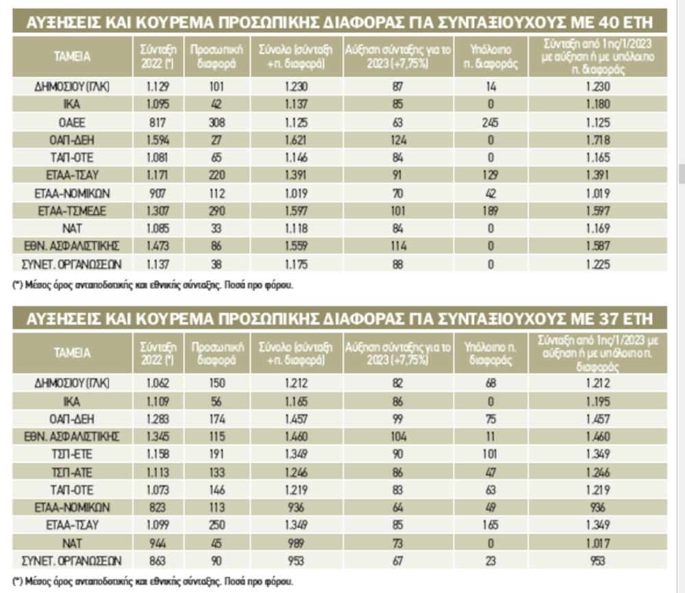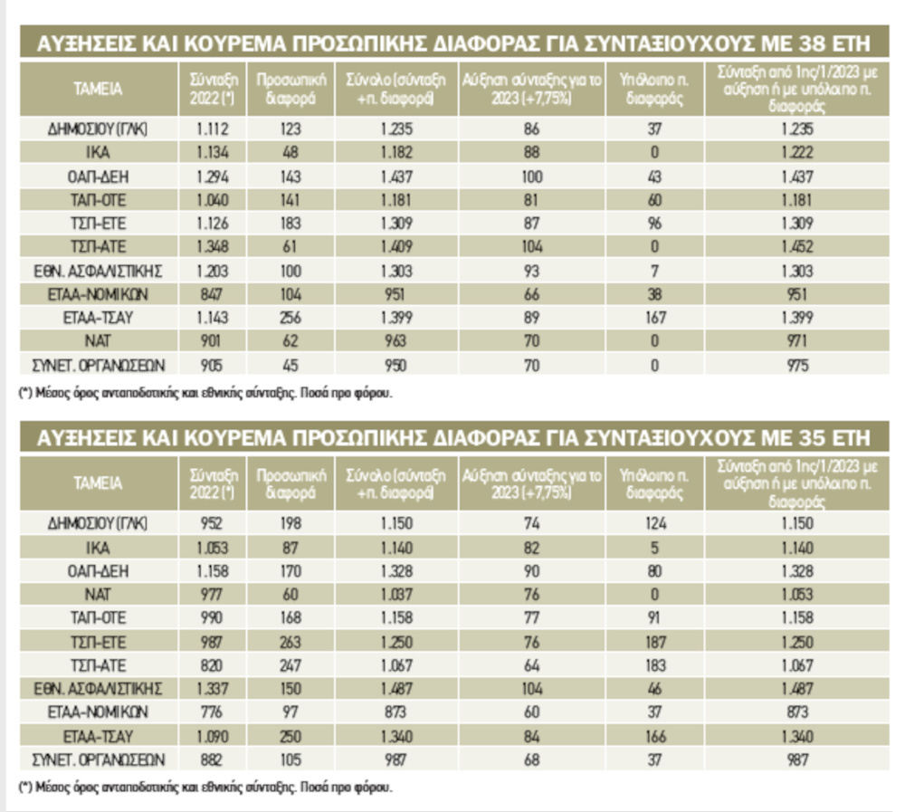 * Συνταξιούχος Δημοσίου με 42 έτη και σύνταξη (εθνική +ανταποδοτική) 1.526 ευρώ έχει υπόλοιπο προσωπικής διαφοράς 55 ευρώ και παίρνει στο σύνολο 1.581 ευρώ. Με την αύξηση 7,75% κερδίζει 118 ευρώ και μηδενίζει την προσωπική διαφορά. Η καθαρή αύξηση είναι 63 ευρώ για το 2023 με τη σύνταξη στα 1.644 ευρώ από 1.581 ευρώ που είχε πριν.