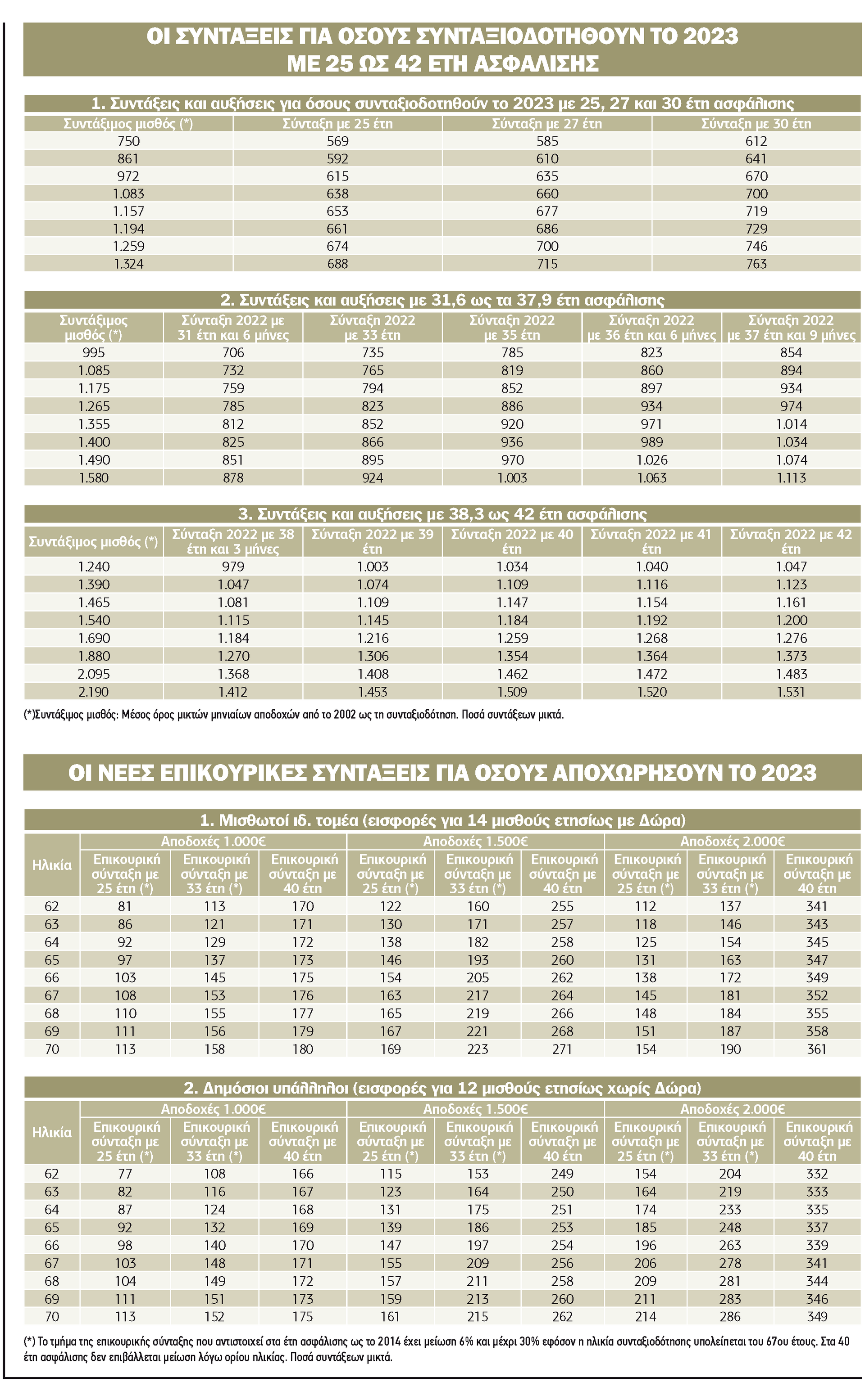*Η εθνική σύνταξη, η οποία μέχρι 31/12/2022 ανερχόταν σε 384 ευρώ για τα 20 έτη ασφάλισης, αυξάνεται από 1ης/1/2023 σε 413,76 ευρώ (αύξηση 7,75%). Συντάξεις κάθε είδους (γήρατος, αναπηρίας και θανάτου) με έναρξη καταβολής από 1ης/1/2023 απονέμονται με εθνική σύνταξη 413,76 ευρώ. Αντιστοίχως αυξάνονται και τα ποσά εθνικής σύνταξης από τα 15 ως τα 19 έτη, όπως και τα κατώτατα όρια της σύνταξης χηρείας από 360 ευρώ στα 387,9 ευρώ.
