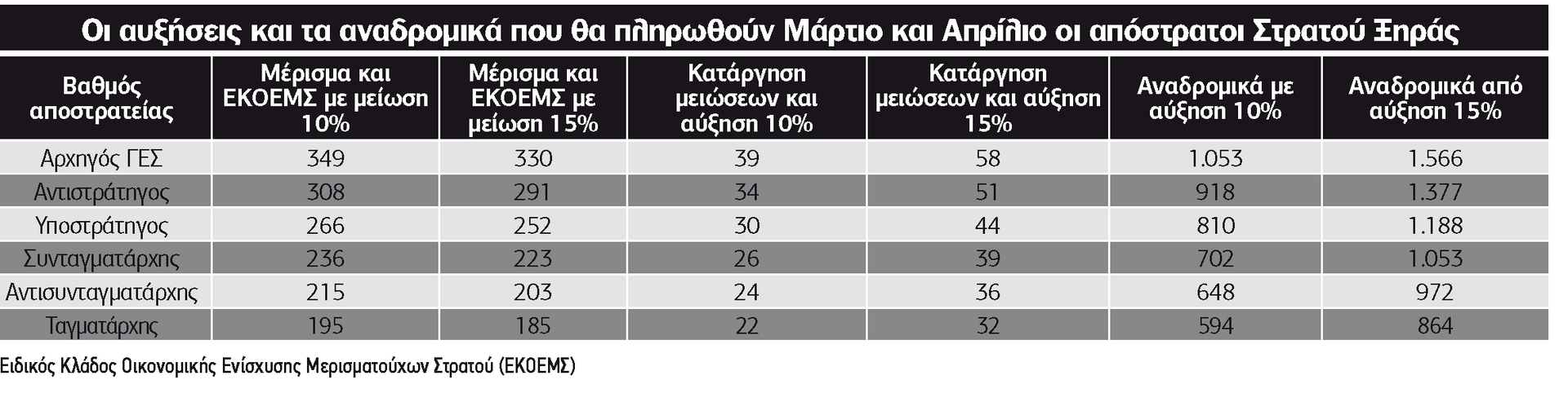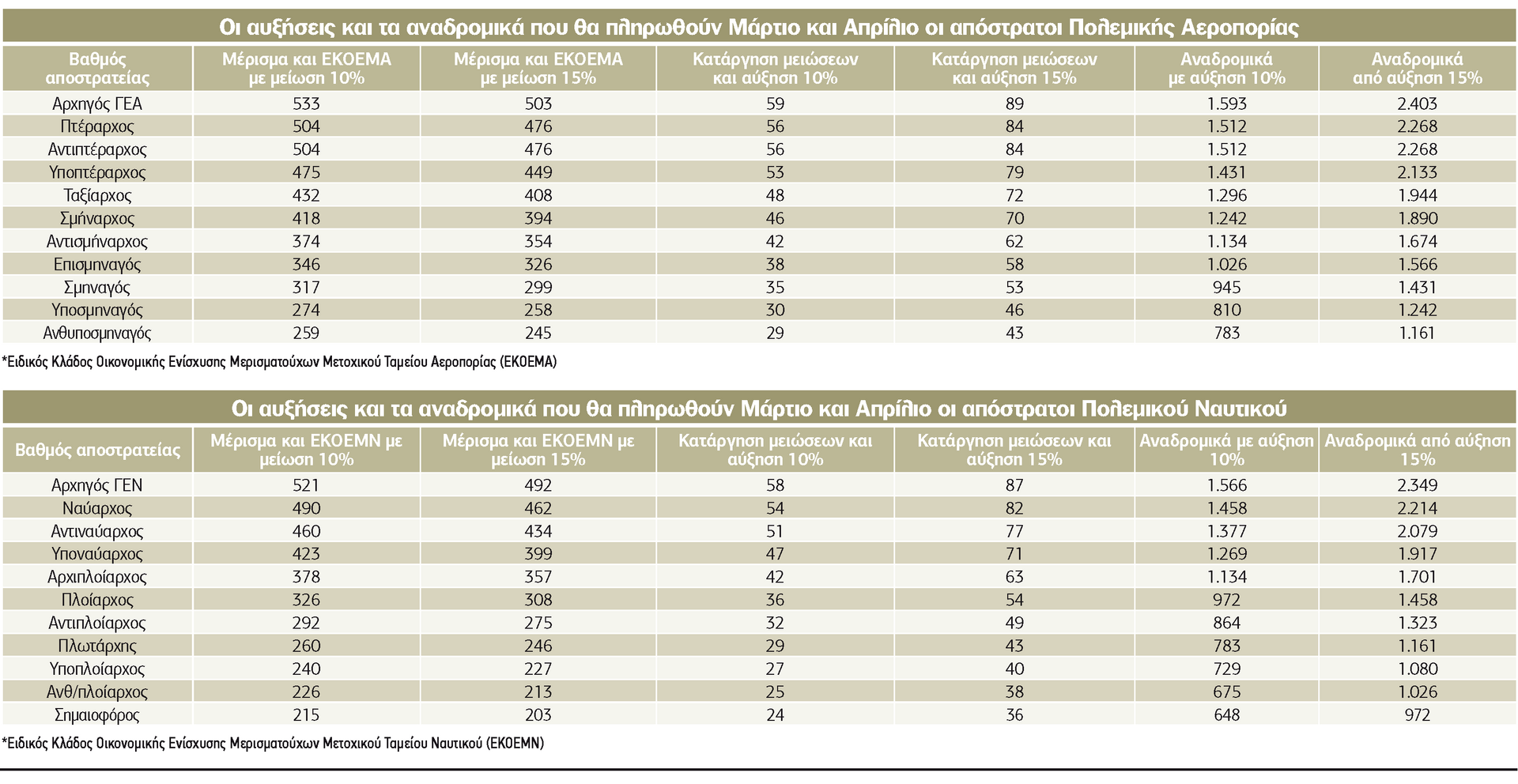 1. Αυξήσεις και αναδρομικά στα μερίσματα που λαμβάνουν 120.000 απόστρατοι από τα μετοχικά τους Ταμεία λόγω της κατάργησης των μειώσεων 5%, 10%, 15% και 20% που επιβάλλονταν από το 2013 με το νόμο 4093. Η πρώτη αύξηση θα πιστωθεί στα μερίσματα μηνός Απριλίου που για τους μεν αποστράτους του Στρατού και του Ναυτικού θα πληρωθούν στο τέλος Μαρτίου, για δε της Αεροπορίας στις 4 Απριλίου. Για τα μερίσματα του Μετοχικού Ταμείου Στρατού ο αρχικός σχεδιασμός ήταν να πληρωθούν χωρίς την παρακράτηση του νόμου 4093 στις 24 Φεβρουαρίου, αλλά όμως ανακοινώθηκε από το Ταμείο πως κάτι τέτοιο δεν κατέστη εφικτό, όπως τους ενημέρωσε η ΗΔΙΚΑ, και η κατάργηση της κράτησης θα γίνει στο μέρισμα Απριλίου που πληρώνεται στις 30 Μαρτίου. Τα αναδρομικά της αύξησης θα πληρωθούν από 1ης/1/2021 ως και τον Μάρτιο του 2023, δηλαδή θα καλύπτουν 27 μήνες. Το πρώτο Ταμείο που θα δώσει μαζί την αύξηση και τα αναδρομικά είναι το Μετοχικό της Αεροπορίας με την πληρωμή των μερισμάτων στις 4 Απριλίου. Αναμένεται να ακολουθήσουν εντός του Απριλίου τα αναδρομικά για τα μερίσματα του Μετοχικού Ταμείου Ναυτικού και στη συνέχεια (Απρίλιο ή Μάιο) τα αναδρομικά για τα μερίσματα του Μετοχικού Ταμείου Στρατού.