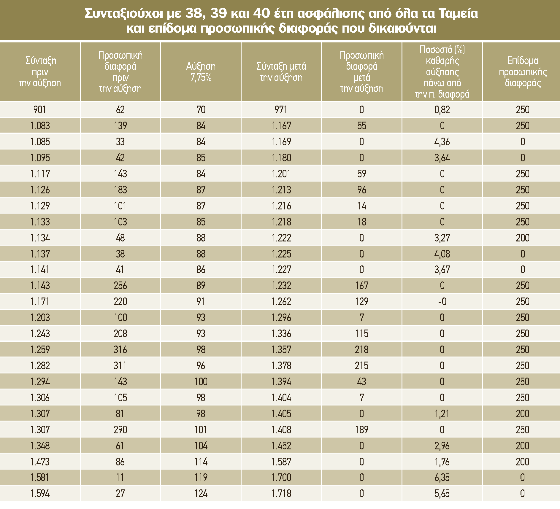 - Συνταξιούχος με 38 έτη και σύνταξη 1.180 ευρώ μετά την αύξηση 7,75% μηδένισε την προσωπική διαφορά και δεν θα πάρει το επίδομα διότι είναι στην κατηγορία σύνταξης άνω των 1.100 ευρώ με αύξηση πάνω από 3,5% μετά την κατάργηση της προσωπικής διαφοράς.
