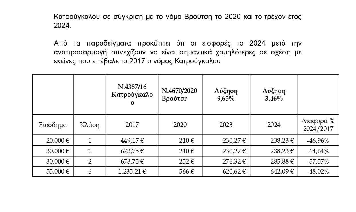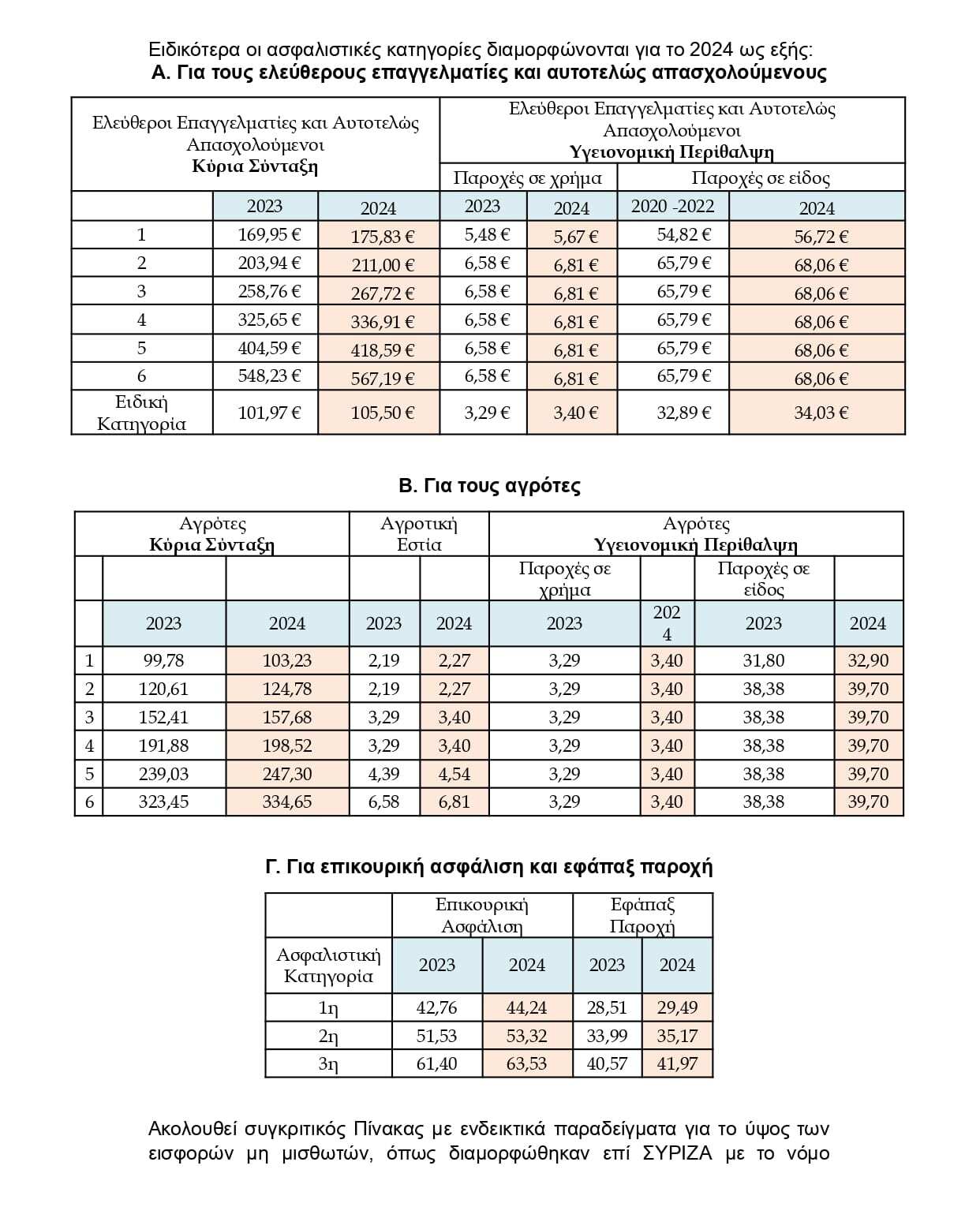 Από τα παραδείγματα προκύπτει, ότι οι εισφορές το 2024, μετά την αναπροσαρμογή, συνεχίζουν να είναι σημαντικά χαμηλότερες σε σχέση με εκείνες που επέβαλε το 2017 ο νόμος Κατρούγκαλου».