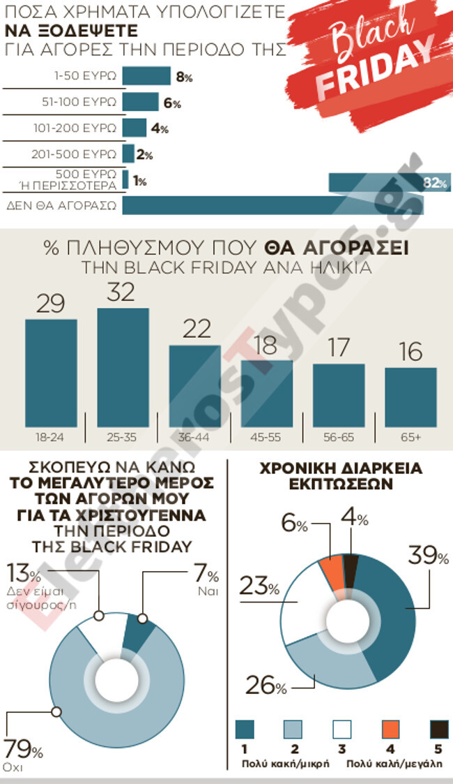 Από εκεί και πέρα, στο ερώτημα «πόσα χρήματα υπολογίζετε να ξοδέψετε, γενικά, για αγορές τη χρονική περίοδο της Black Friday;», το 80% σημειώνει ότι δεν θα δαπανήσει τίποτα, το 8% ότι θα ξοδέψει μέχρι 50 ευρώ, το 6% έως 100 ευρώ, το 4% από 101 έως 200 ευρώ, το 2% από 200 έως 500 ευρώ και το 1% πάνω από 500 ευρώ.