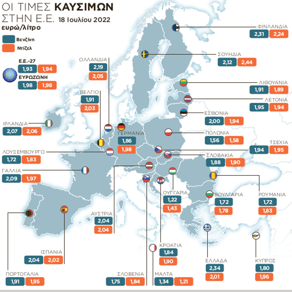 Ο μέσος όρος της τιμής βενζίνης στην Ε.Ε. ήταν 1,93 και του ντίζελ 1,94 ευρώ/λίτρο και στην ευρωζώνη 1,98 ευρώ και για τα δύο.