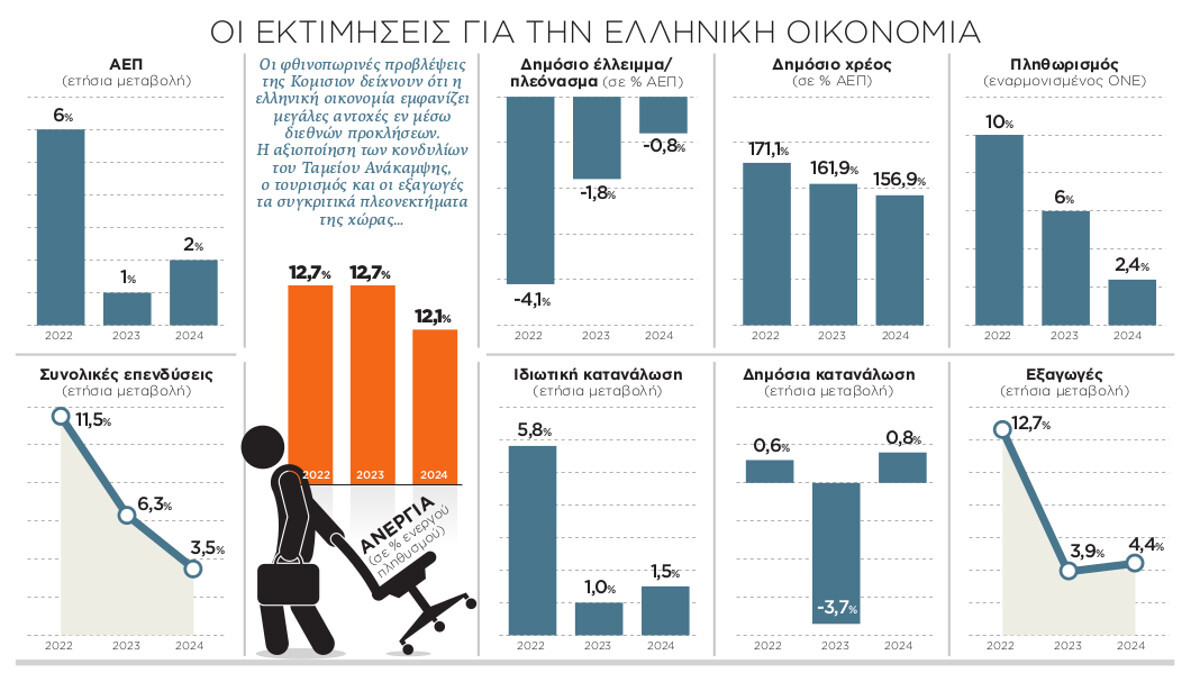 Η επιβράδυνση του χρόνου αναμένεται να επηρεάσει την απασχόληση, η οποία ενώ φέτος θα αυξηθεί 1,9%, το 2023 και το 2024 οι αυξήσεις θα είναι μικρότερες, στο 0,4% και 0,6% αντίστοιχα. Η ανεργία που μειώθηκε θεαματικά τα τελευταία δύο χρόνια θα κάνει μια παύση της μείωσης του χρόνου και το 2024, προφανώς λόγω της επιβράδυνσης της ανάπτυξης.