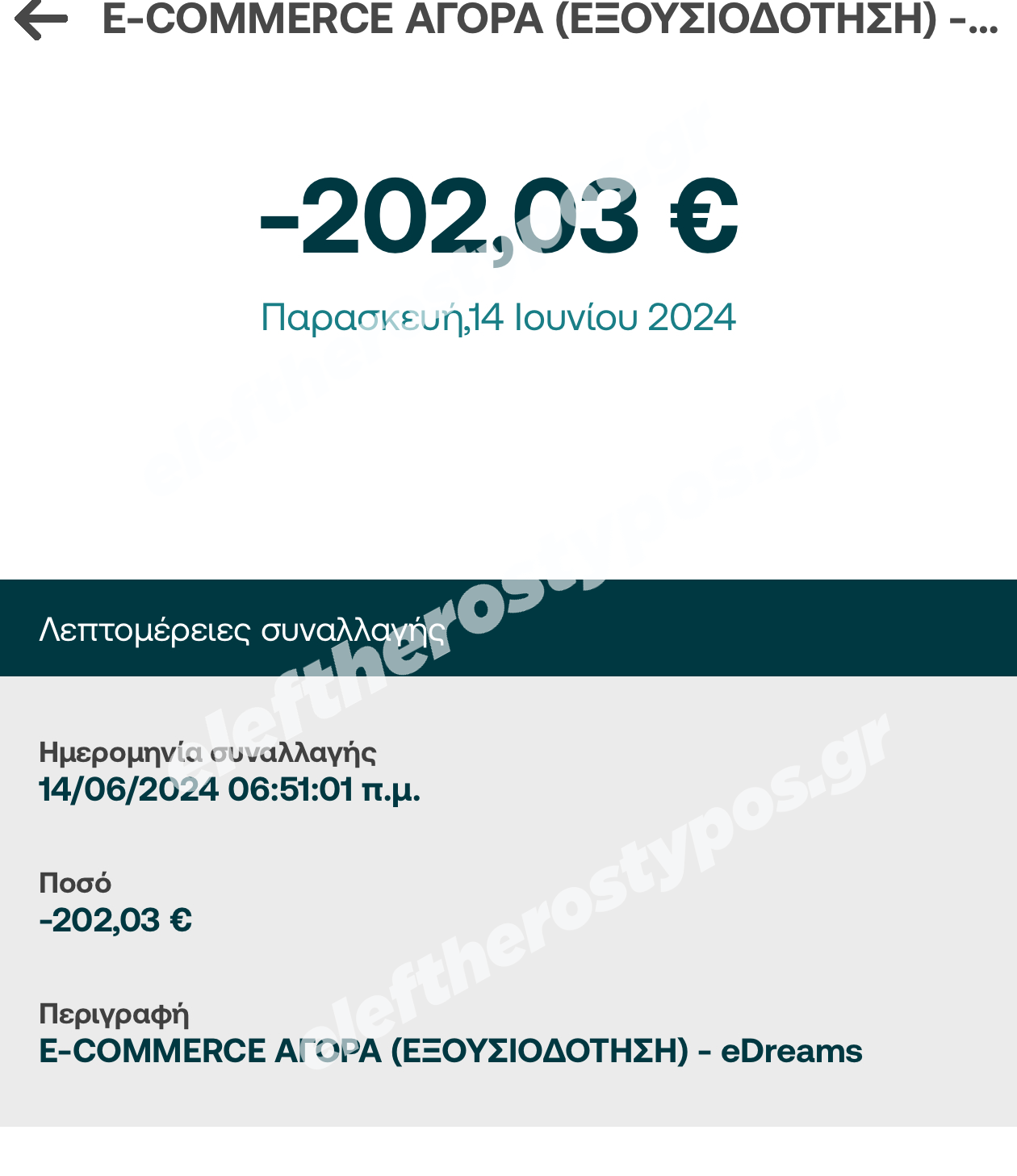 Συγκεκριμένα, σήμερα στις 07:51 ο πελάτης της Εθνικής Τράπεζας έλαβε το παρακάτω e-mail: «Αγαπητέ πελάτη σας ενημερώνουμε για την αγορά ποσού 202,03 EUR από ΑΓΟΡΑ eDreams με χρεωστική κάρτα μέσω του λογ/σμού *6263 14/06/2024 07:51:01 Τηλ. ETE +30 210 48 48 484». Το σοκ ήταν μεγάλο και η επιβεβαίωση ότι κάτι δεν πήγαινε καλά ήρθε από το app της Εθνικής Τράπεζας, το οποίο εμφάνιζε τα 202,03 ευρώ να έχουν «κάνει φτερά» και να κατευθύνονται προς την «εταιρία» eDreams! Έξαλλος ο πελάτης, κάλεσε την τηλεφωνική εξυπηρέτηση της Τράπεζας. Όση ώρα έδινε τις φωνητικές (sic) εντολές, δέχθηκε τρία απανωτά αιτήματα έγκρισης ποσού 265 ευρώ, τα οποία απέρριψε άμεσα.