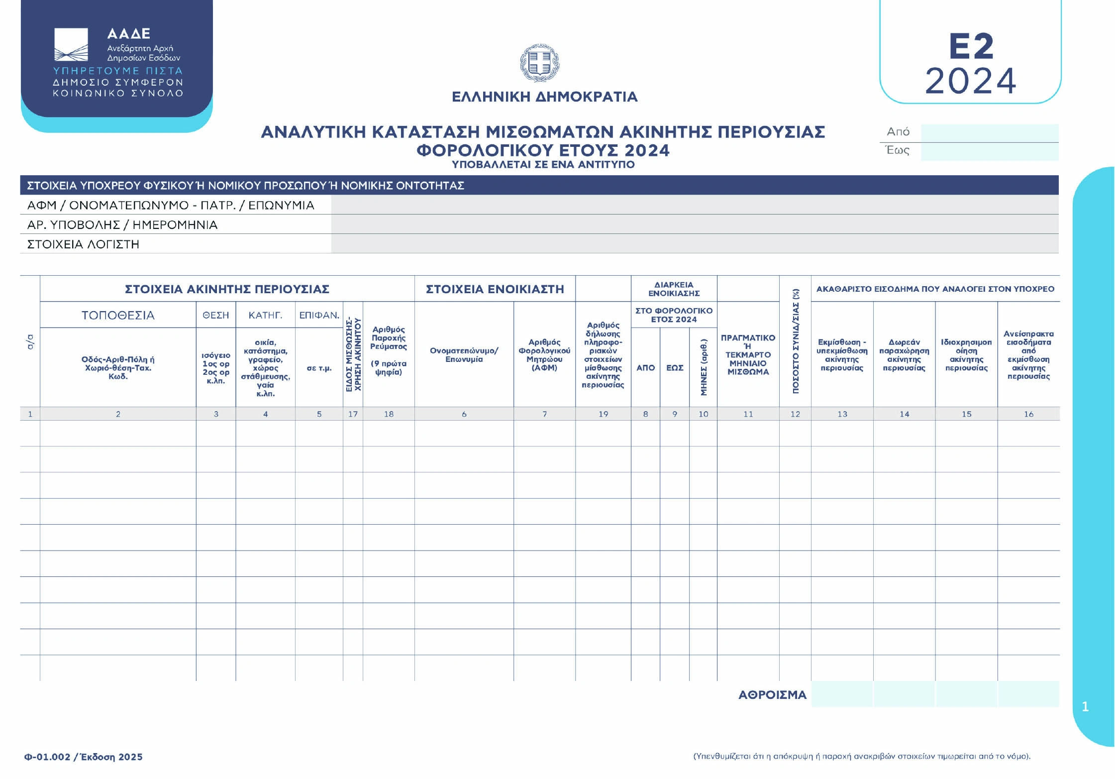 Επιπλέον, τα στοιχεία για τα λοιπά μισθώματα που εισέπραξε κάθε ιδιοκτήτης κατά τη διάρκεια του 2024 θα είναι κι αυτά προσυμπληρωμένα στο φετινό Ε2 με βάση τα στοιχεία του περυσινού εντύπου Ε2. Αν, όμως, κατά τη διάρκεια του 2024 επήλθαν μεταβολές στη χρήση των εκμισθούμενων ακινήτων ή στους ενοικιαστές και στα ποσά των μισθωμάτων, λόγω λύσεων ή ανανεώσεων συμβάσεων μίσθωσης ή λόγω σύναψης νέων συμβάσεων μίσθωσης, ο κάθε ιδιοκτήτης θα πρέπει να παρέμβει στα προσυμπληρωμένα στοιχεία και να τα μεταβάλει, αναγράφοντας τα ορθά στοιχεία και ποσά, τα οποία μεταβλήθηκαν εντός του 2024.