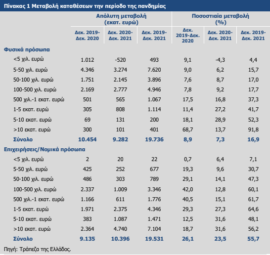 Σημαντική ήταν και η μεταβολή στις καταθέσεις των επιχειρήσεων, ένα μερίδιο που ενισχύεται σταδιακά, φθάνοντας το 26,5% στο τέλος του 2021, έναντι 20,2% το 2019 και 18,5% το 2015, ενώ εκείνο των φυσικών προσώπων υποχώρησε σε 69,6% το 2021 από 70,3% το 2019 και 76% το 2015. Σύμφωνα με την ΤτΕ, οι εξελίξεις αυτές επηρεάστηκαν, κυρίως, από τη θετικότερη εξέλιξη της πιστωτικής επέκτασης προς τις επιχειρήσεις τα τελευταία έτη και ιδιαίτερα στη διάρκεια της πανδημίας από τα μέτρα ενίσχυσης της ρευστότητας των επιχειρήσεων, σε αντίθεση με τον τομέα των νοικοκυριών που χαρακτηρίζεται από αρνητική καθαρή ροή τραπεζικών δανείων εδώ και πολλά έτη. Εδώ επισημαίνεται και η θετική επίπτωση από τη στροφή στις ηλεκτρονικές συναλλαγές, που είναι ένας πρόσθετος παράγοντας που επηρεάζει τα διαθέσιμα των επιχειρήσεων στις τράπεζες.
