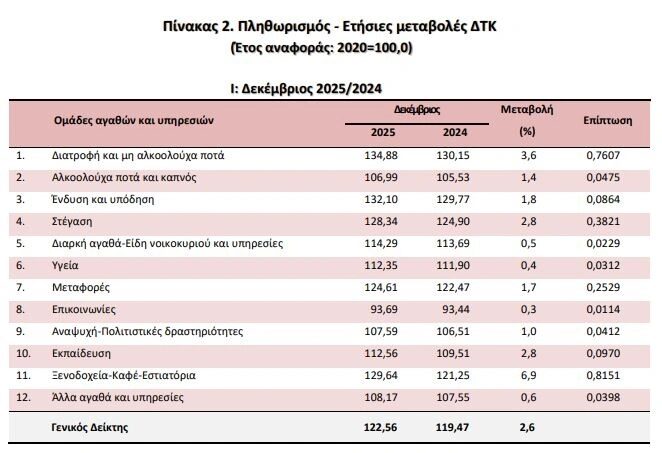 Σύμφωνα με την ΕΛΣΤΑΤ, ο δείκτης τιμών καταναλωτή (ΔΤΚ) αυξήθηκε τον Δεκέμβριο με ρυθμό 2,6% μετά από το 2,4% ετησίως τον Νοέμβριο και το 2% του Οκτωβρίου. Στη μηνιαία σύγκριση, ο Γενικός ΔΤΚ κατά τον Δεκέμβριο σε σύγκριση με τον Νοέμβριο παρουσίασε αύξηση 0,3%, έναντι αύξησης 0,1%. Σε ετήσια βάση, το μεγαλύτερο μέρος των πληθωριστικών πιέσεων προήλθε από την κατηγορία Διατροφή και μη αλκοολούχα ποτά, η οποία παρουσίασε αύξηση τιμών 3,6%. Εντός της κατηγορίας παρατηρούνται ισχυρές ανατιμήσεις 10,6% στα φρούτα, 13,1% στο κρέας, 20% στις σοκολάτες και 20,9% στον καφέ.