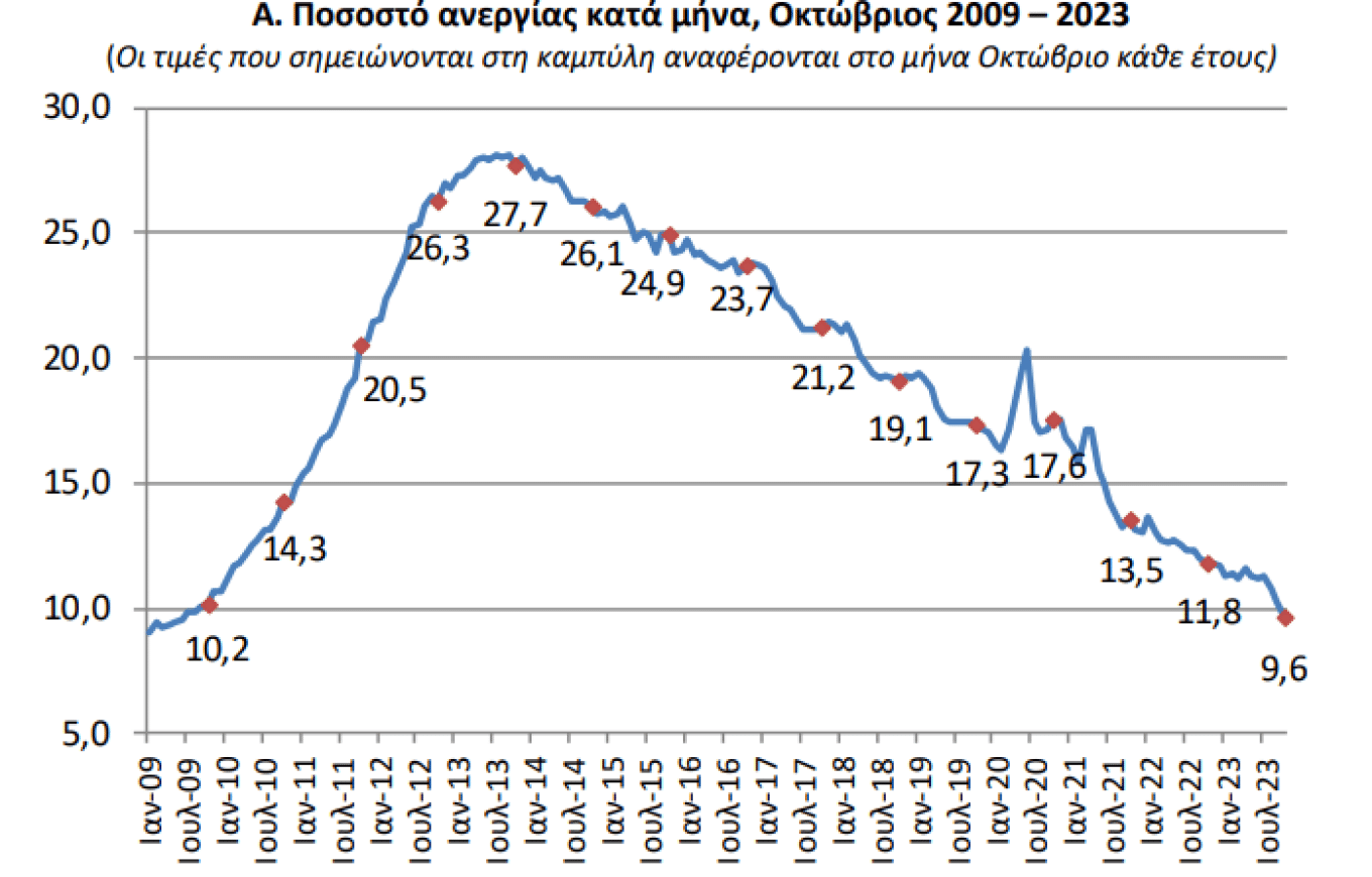 Έσπασε το «φράγμα» του 10% το ποσοστό της ανεργίας στην Ελλάδα τον Οκτώβριο, όπως ανακοίνωσε σήμερα η Ελληνική Στατιστική Αρχή. Ειδικότερα στο 9,6% ανήλθε το εποχικά διορθωμένο ποσοστό ανεργίας τον Οκτώβριο του 2023, έναντι 11,8% τον Οκτώβριο του 2022 και του αναθεωρημένου προς…