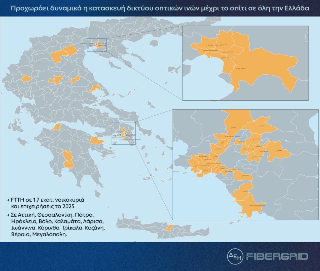 Με το δίκτυο Fiber to the Home της ΔΕΗ FiberGrid να έχει φτάσει ήδη σε 140.000 σπίτια σε 12 δήμους της Αττικής, σε μόλις 10 μήνες, η εταιρεία ανέθεσε με διαγωνιστική διαδικασία σε 12 αναδόχους την κατασκευή δικτύου Fiber to the Home σε επιπλέον περιοχές στην Αττική και σε Θεσσαλονίκη, Πάτρα, Ηράκλειο, Βόλο, Καλαμάτα, Λάρισα, Ιωάννινα, Κόρινθο, Τρίκαλα, Κοζάνη, Βέροια, και Μεγαλόπολη. Οι περιοχές έχουν επιλεγεί με βάση μεταξύ άλλων την πληθυσμιακή κάλυψη και την έλλειψη υποδομών FTTH.