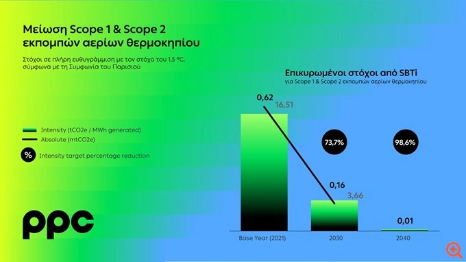 – μείωση 98,6% ανά παραγόμενη MWh των Scope 1 και Scope 2 εκπομπών αερίων θερμοκηπίου